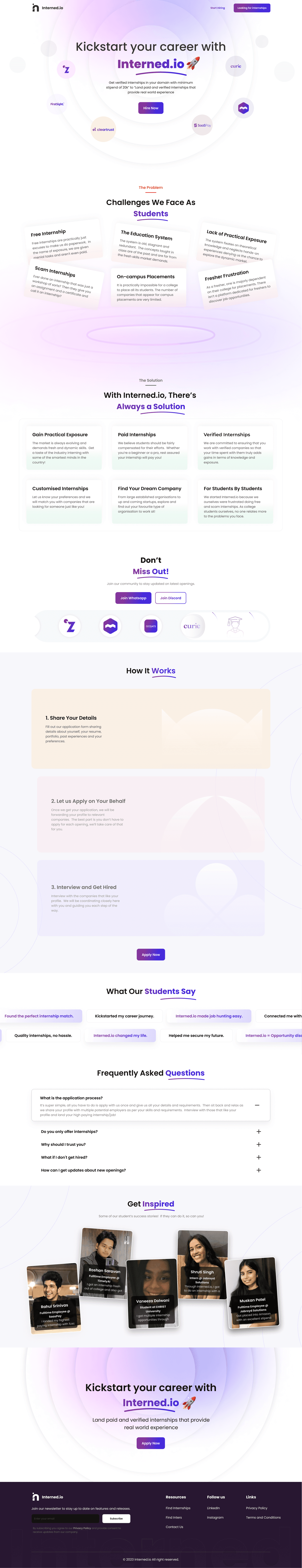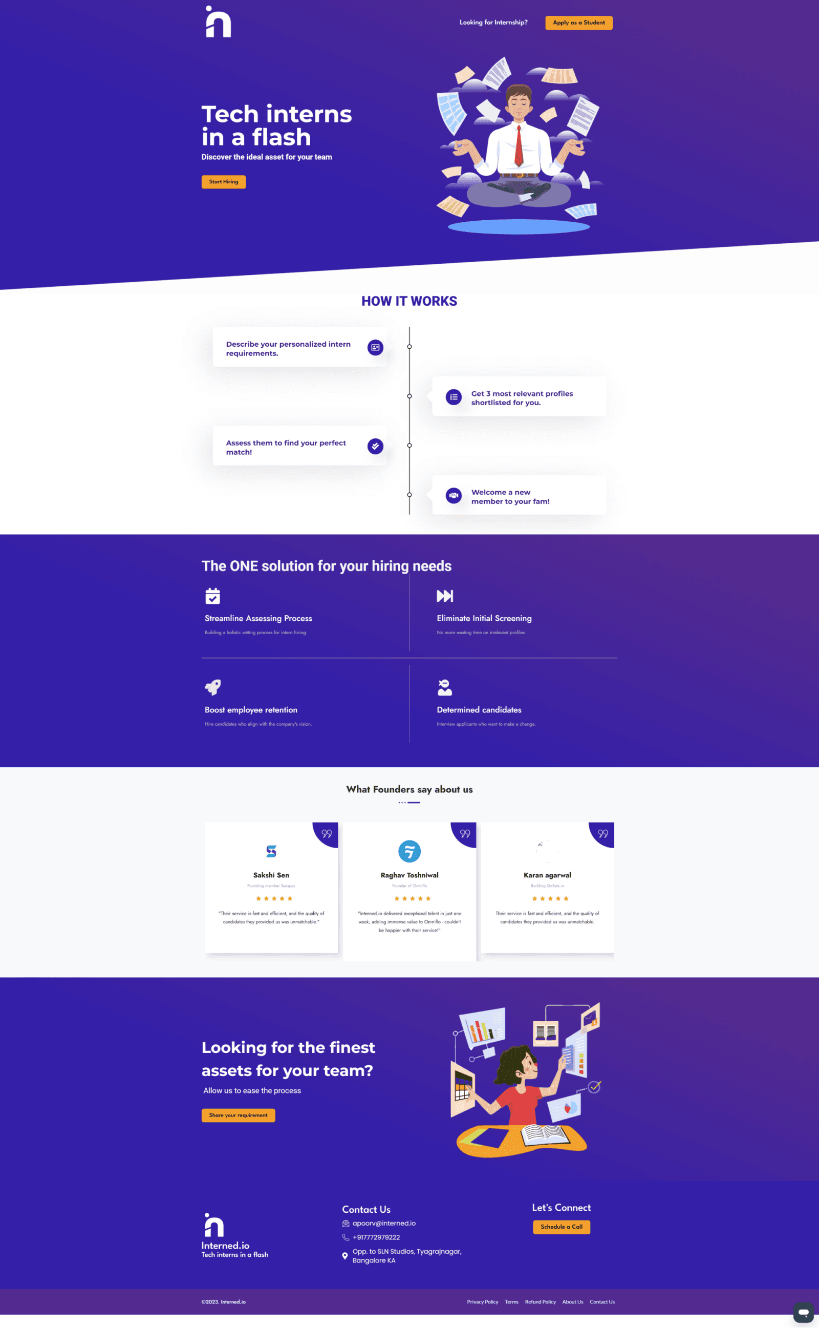 Interned.io - The website aims to cater for two different sets of individuals - students looking for tech internships and founders looking to hire tech interns. Website will be the first point of contact with our ICP (Founders, HRs, Interns) Since our company is also our domain name, it is easy for anyone to reach our website by just touching or clicking on our company name anywhere they come across it (email, linkedin post, cold message, etc)
